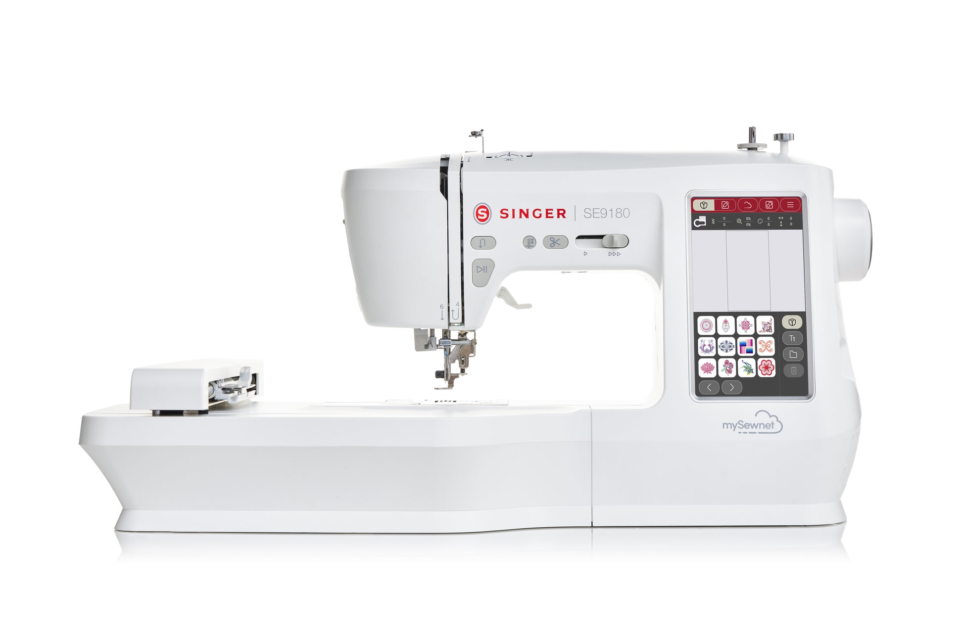 The SINGER® SE9180 sewing and embroidery machine is loaded with user-friendly features that sewists of all levels love like a large 7" touch screen so you can clearly see what you are stitching, and an automatic needle threader that will get you sewing in no time at all. Also, mySewnet™ connectivity gives you a whole world of possibilities from app notifications of your embroidery progress, to creating designs from scratch and so much more. With over 150 built-in embroidery designs and over 250 stitches, you get the best of both worlds with the Singer SE9180 sewing and embroidery machine.